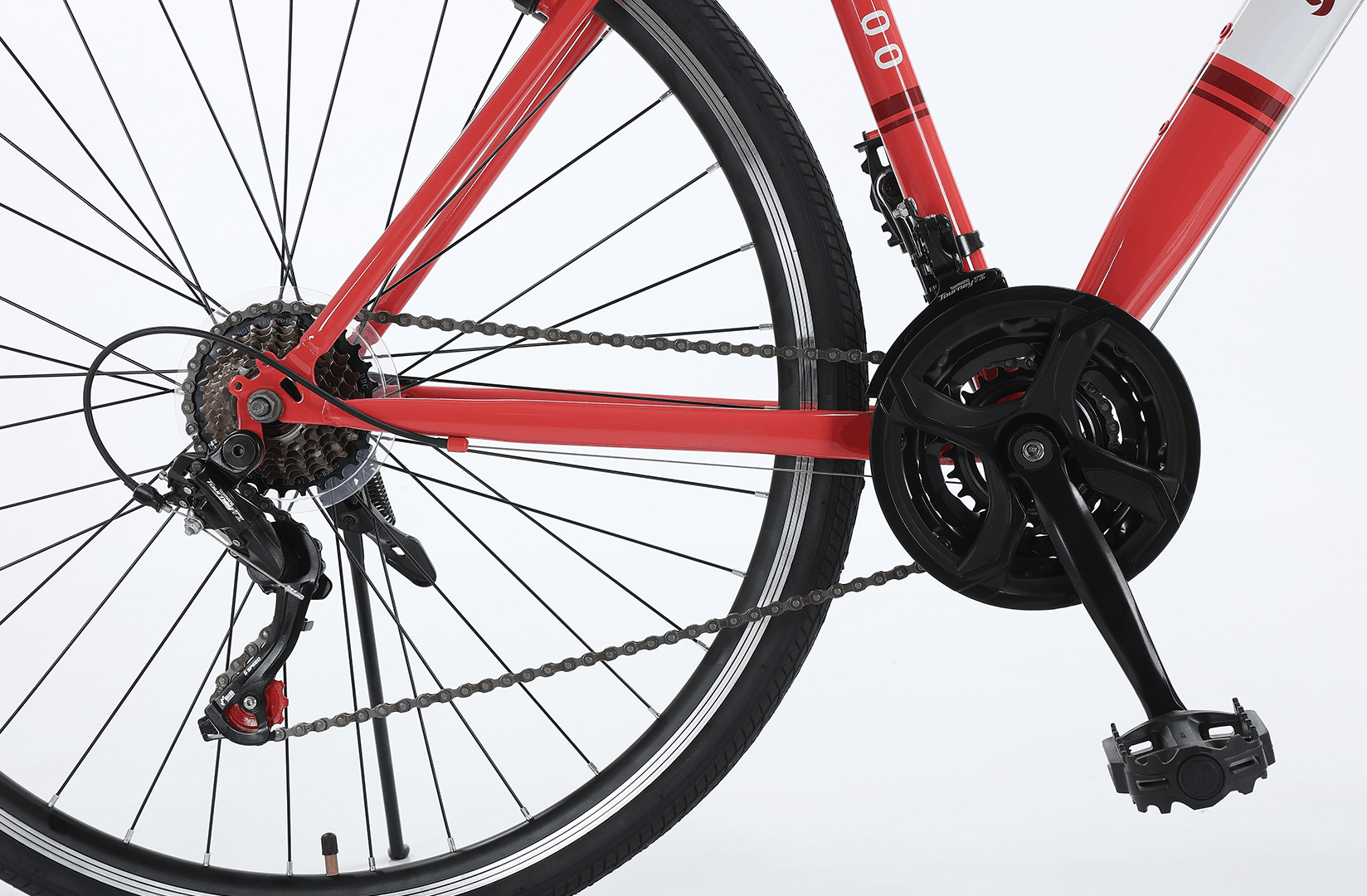 Shimano pogonski sustav s 21 brzinom (3×7) omogućuje jednostavno prilagođavanje različitim terenima. Pouzdane aluminijske V-kočnice osiguravaju sigurno i precizno kočenje.